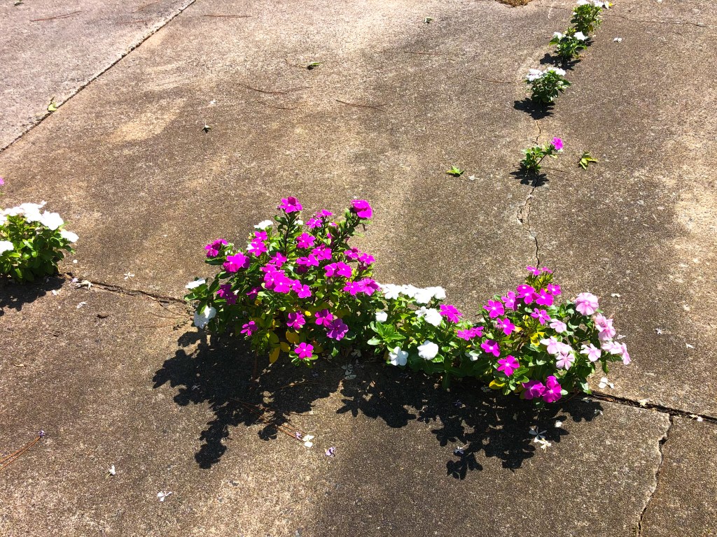 “Yet, the seeds that clung to the cracks, that found a home in the broken concrete, survived the cold winter by digging deep into the good soil beneath their strong shelter. When the howling winds and the icy rain came, the seeds remained warm and safe in their refuge. The winter sun warmed the concrete, and just the right amount of water drained into the soil through the cracks. When Spring came again, the seeds were strong and healthy. They brought forth lush, green seedlings that erupted into a cascade of beautiful blooms.”
