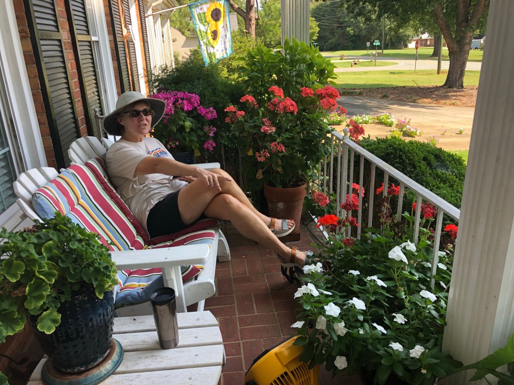 only a faint glow marks the horizon as I make my way to my front porch perch. Cushions in place, my feet on my low footstool, I nestle in and begin to rock. The cicadas have their volume set on high. The birds to my left hit the first note of the morning playlist, and their partners to my right chime in with perfect pitch. The squirrels scamper up the old pine tree in front of me as if playing a game of hide-and-seek.